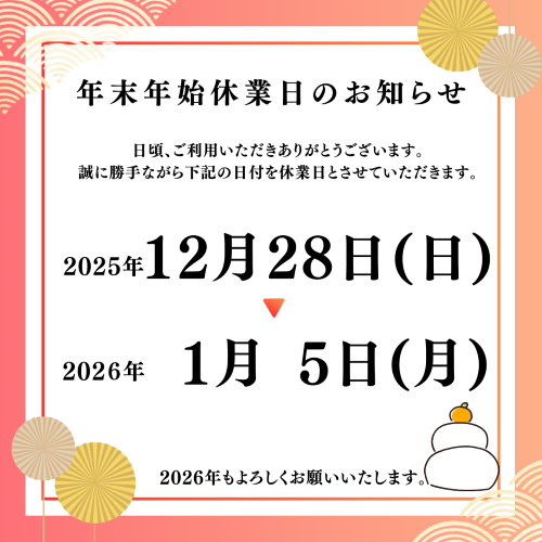 誠に勝手ながら、年末年始の休業日を下記の通りとさせていただきます。
