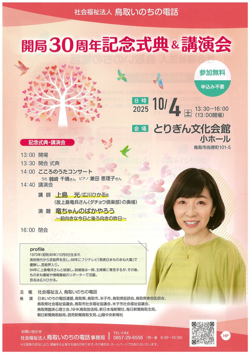 鳥取いのちの電話事務局 0857-29-6556(月~金 9:00~16:00)2025年10月4日(土)