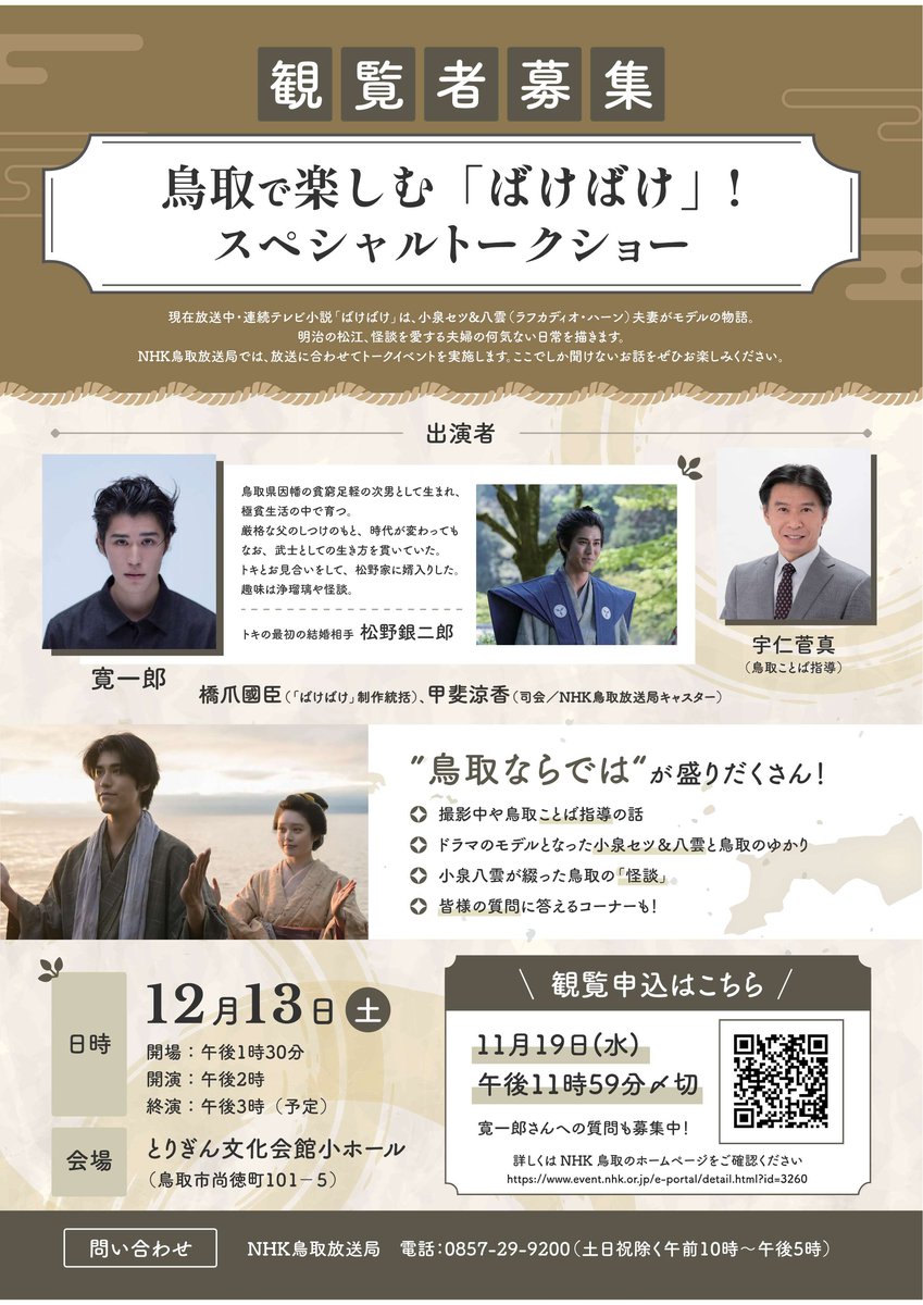 NHK鳥取放送局では、連続テレビ小説「ばけばけ」で鳥取県出身の松野銀二郎役を演じる寛一郎さんと、鳥取ことば指導を担当した倉吉市出身・宇仁菅真さんを招いたトークイベントを行います。撮影の裏話や鳥取に関する話題のほか、ドラマのモデルである小泉セツ&八雲夫妻と鳥取のゆかりについてたっぷりとお届けします。観覧される皆さまからの質問も受け付ける予定ですので、ここでしか聞けないお話をぜひお楽しみください。 <ゲスト>寛一郎(松野銀二郎役)、宇仁菅真(鳥取ことば指導担当)、橋爪國臣(「ばけばけ」制作統括) <司 会>甲斐涼香(NHK鳥取放送局キャスター)