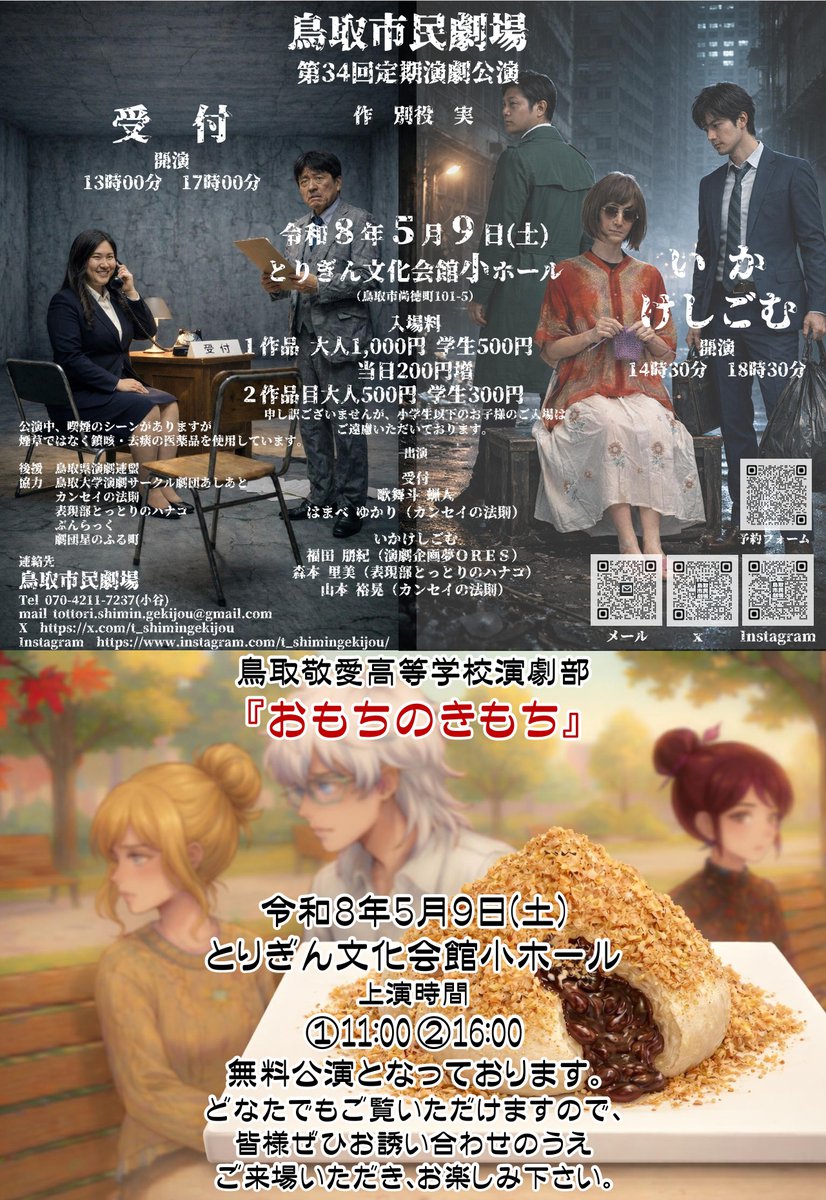 鳥取市民劇場 第34回定期演劇公演『受付』『いかけしごむ』 別役実の不条理劇を2作品を上演します。 申し訳ございませんが、小学生以下のお子様のご入場はご遠慮いただいております。 鳥取敬愛高等学校演劇部公演 『おもちのきもち』 ほろ苦い恋愛劇? 不思議な演劇です。 こちらは無料公演となっております。 どなたでもご覧になっていただけます。 みなさんぜひ足をお運び頂きお楽しみ下さい。 https://x.com/t_shimingekijou
