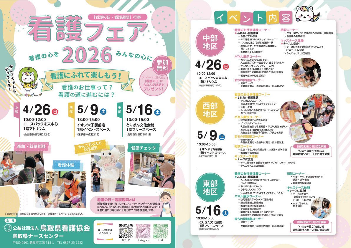 近代看護の基礎を築いたフローレンス・ナイチンゲールの誕生日にちなんで、5月12日は「看護の日」と制定されました。毎年この時期に合わせて看護を知って、見て、体験するイベント「看護フェア」を開催しています。 イベントは看護体験やパネル展示、健康チェック、進路・就業相談、キッズナース体験等、5つのコーナーで“看護”を感じることができます。 毎年大人気の「看護の日」キャラクターかんごちゃんと記念撮影コーナーもあり! 実際に体験して“看護”に対する意識や知識をバージョンアップしましょう!参加は無料です。お気軽に遊びにお越しください!