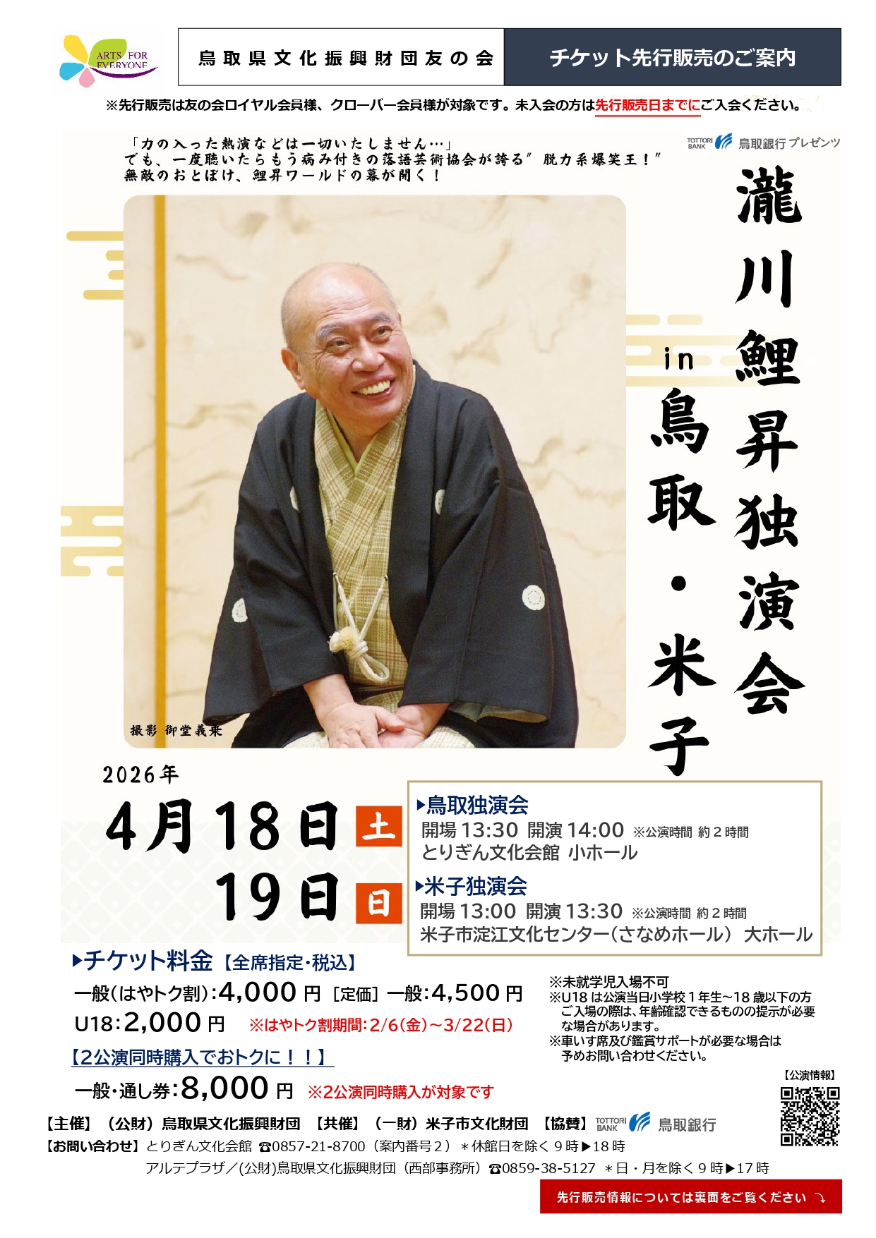 <鳥取県文化振興財団友の会先行販売> 2026年2月6日(金曜日)~ 8日(日曜日)