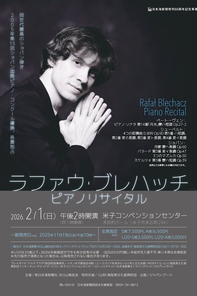 TOP > アルテプラザ > インフォメーション 【公演主催者様向け】チケット販売依頼書 改定のお知らせ 営業スケジュール 年末年始休業日のお知らせ 鳥取県文化振興財団 鑑賞プログラム お得なはやトク割は3月22日(日)まで!瀧川鯉昇 独演会 in 鳥取・米子 2026年4月18日(土曜日)とりぎん文化会館 小ホール 2026年4月19日(日曜日)米子市淀江文化センター 大ホール 特別共催事業 終了公演 【終了】ラファウ・ブレハッチ ピアノリサイタル2026 2026年2月1日(日曜日)米子コンベンションセンター 【終了】上妻宏光「生一丁!」Tour 2025-2026 2026年1月18日(日曜日)米子市文化ホール メインホール 【終了】千住真理子ヴァイオリン・リサイタル スペシャルゲスト・千住明 2025年12月14日(日曜日)米子市公会堂 大ホール 【終了】新日本フィルハーモニー交響楽団 アンサンブル・コンサート 境港公演 2025年11月2日(日曜日)境港市文化ホール(境港シンフォニーガーデン) 【終了】ヴァイオリン&ヴィオラ リクエストコンサート 2025年10月5日(日曜日)境港市文化ホール(境港シンフォニーガーデン) 【終了】B→C 山本耕平テノールリサイタル(米子公演) 2025年9月27日(土曜日)米子市文化ホール メインホール 【終了】野村万作・萬斎 狂言公演 2025年9月5日(金曜日)米子市公会堂 大ホール 【終了】新日本フィルハーモニー交響楽団 米子公演 2025年7月19日(土曜日)米子市公会堂 大ホール 【終了】イ・ヒョク ピアノリサイタル 2025年7月6日(日曜日)米子市公会堂 大ホール