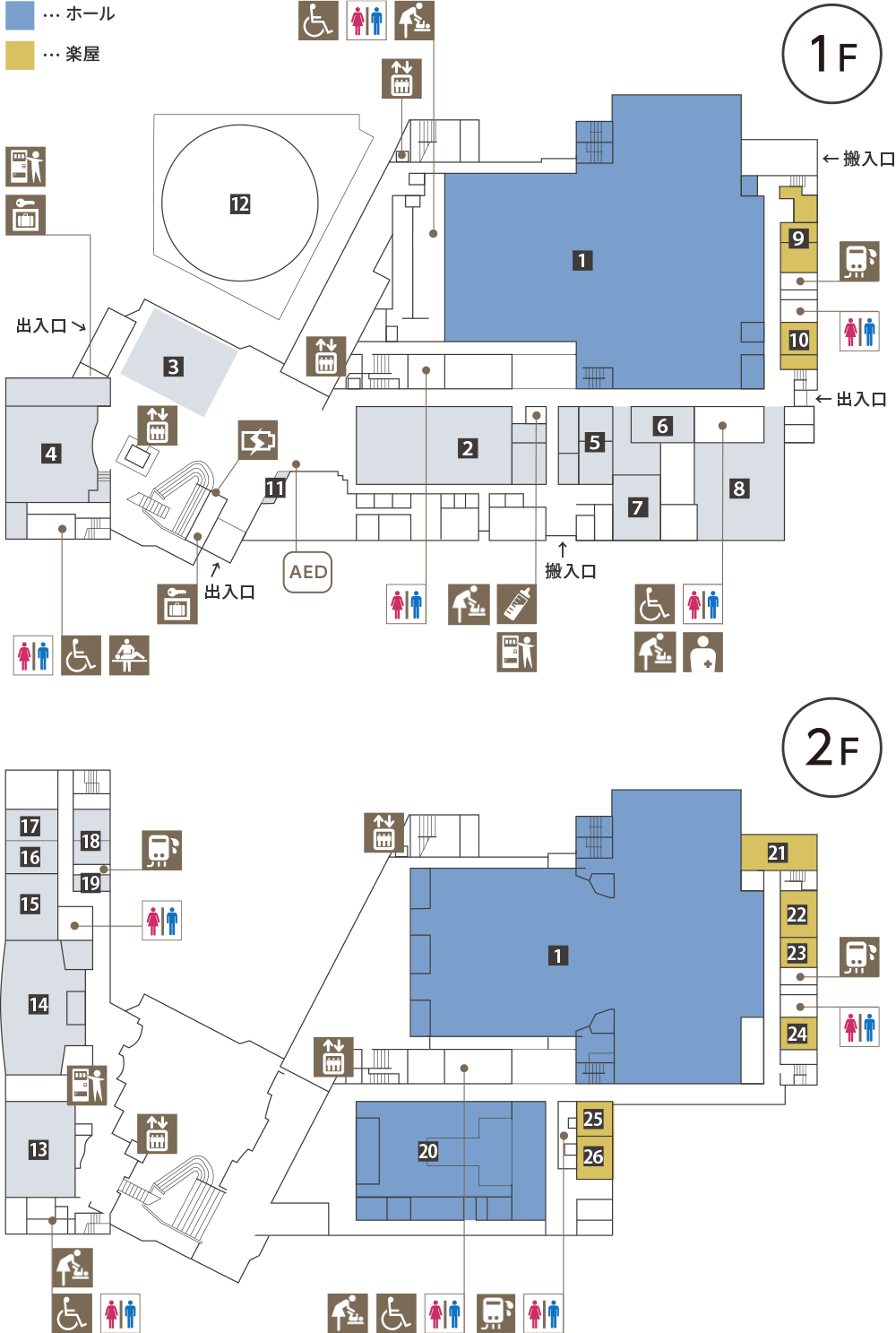 会議棟2階給湯室、梨花ホール楽屋(1階・2階)、小ホール楽屋にあります。