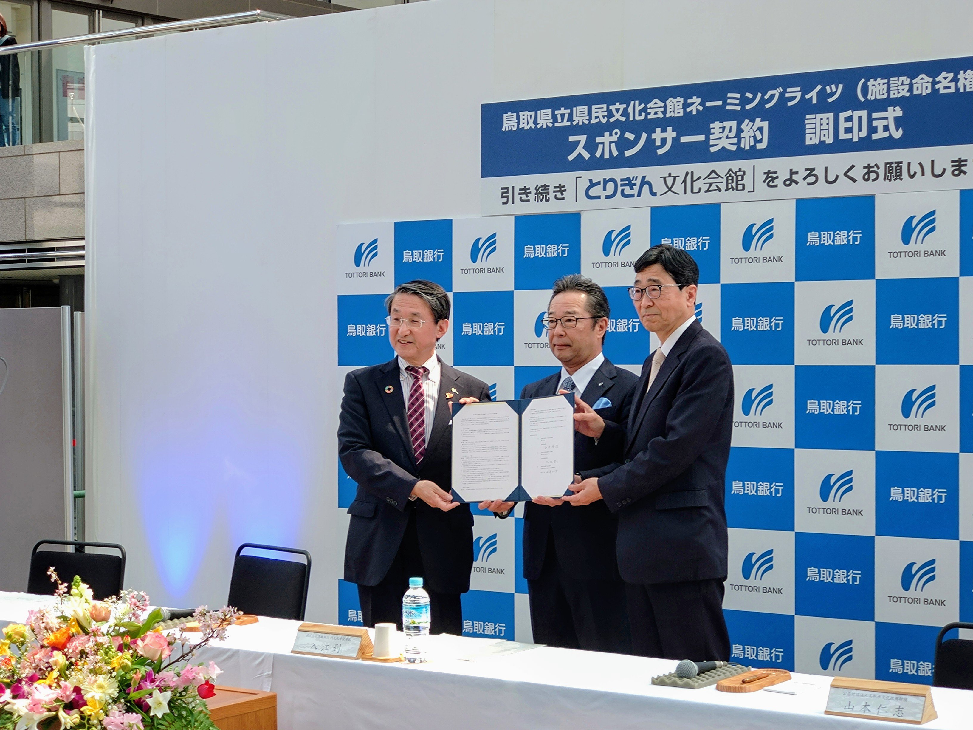 鳥取銀行さまとのネーミングライツスポンサー契約更新に伴い、調印式を執り行いました。