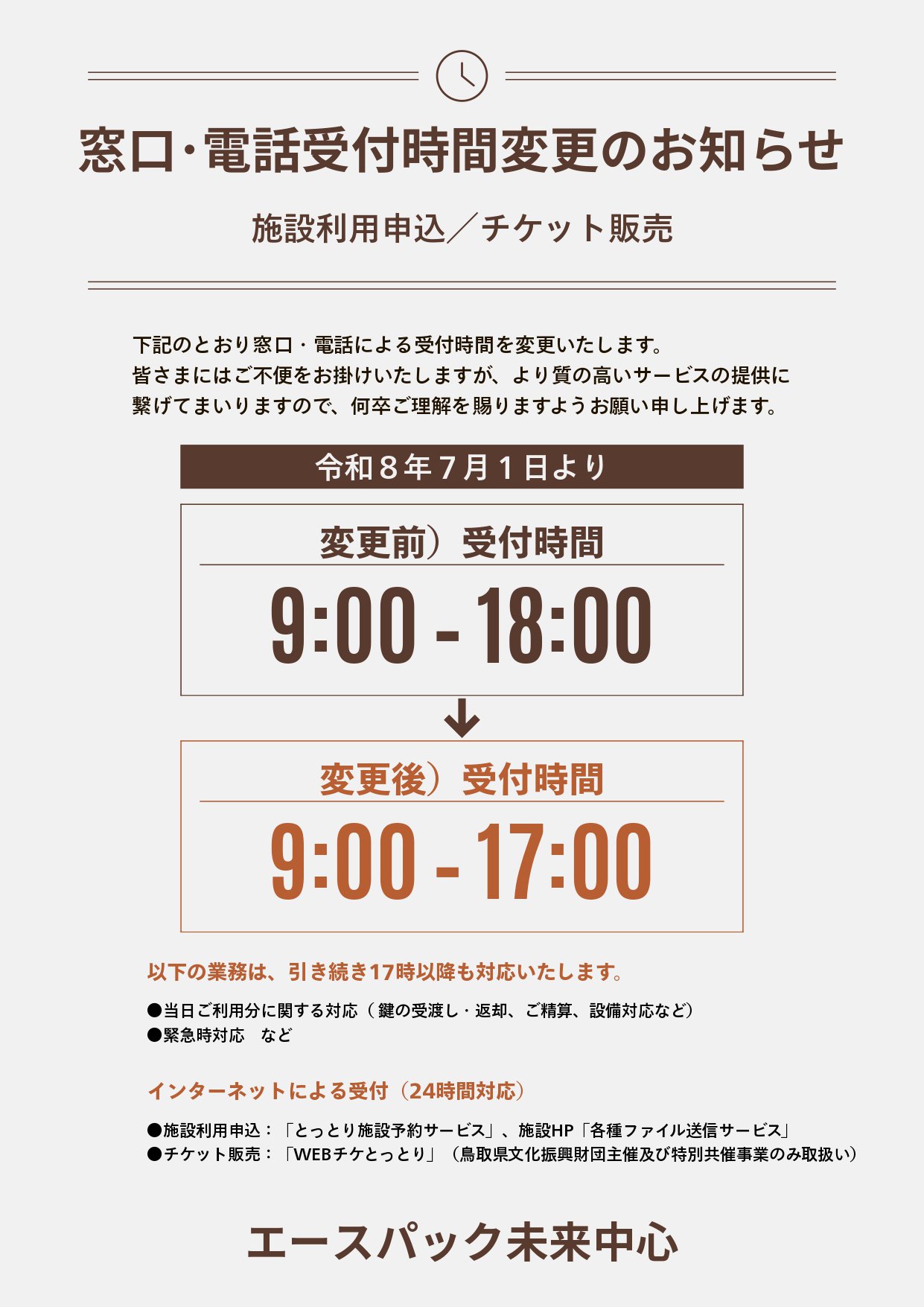今後、当日ご利用のお客様へのサポート、事前打合せ・下見、各種相談など、専門的な業務への対応についても、さらなる充実を図るため、このたび、対面での窓口・電話受付時間の見直しを行うことといたしました。