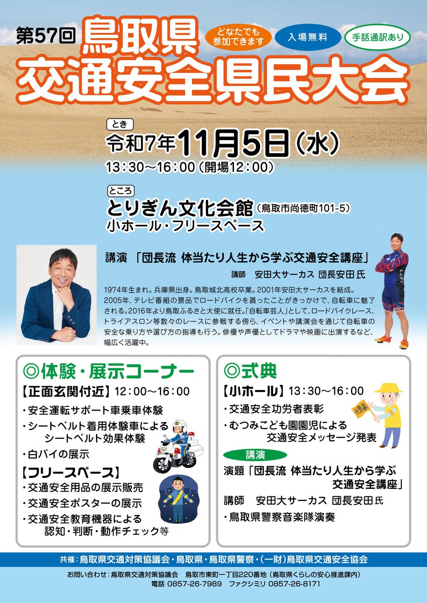 本大会は、交通安全に顕著な功績のあった個人および団体を表彰するとともに、講演会や園児による交通安全メッセージの発表等を通じて、県民の交通安全意識の一層の向上を図り、悲惨な交通事故をなくすことを目的として開催するものです。 講演会では、「団長流 体当たり人生から学ぶ交通安全講座」と題し、トライアスロンやロードバイクレースに参戦するなど自転車芸人としてもご活躍中の安田大サーカス・団長安田氏を講師としてお迎えします。また、園児による交通安全メッセージは、むつみこども園年長児が元気いっぱいの鳴子踊りで会場を盛り上げます。 そのほか、白バイの展示、警察音楽隊の演奏、交通安全教育機器の体験などありますので、是非ご来場ください。