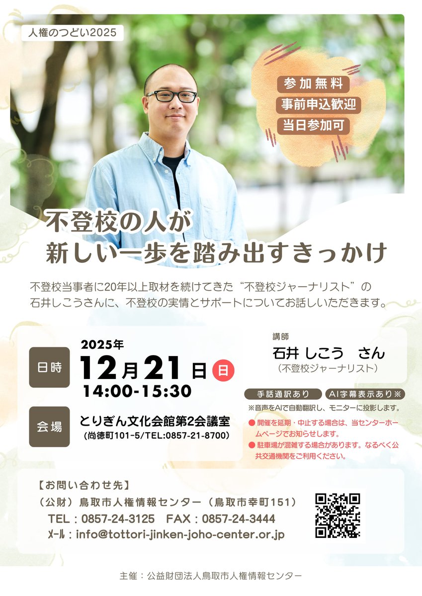 人権のつどい2025石井しこうさん講演会 「不登校の人が新しい一歩を踏み出すきっかけ」 講師:石井しこうさん(不登校ジャーナリスト) 内容:不登校当事者に20年以上取材を続けてきた“不登校ジャーナリスト”の石井しこうさんに、不登校の実情とサポートについてお話しいただきます。