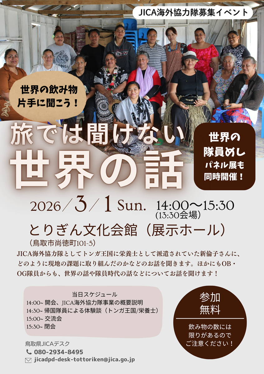 鳥取県JICAデスク 080-2934-8495 メール jicadpd-desk-tottoriken@jica.go.jp