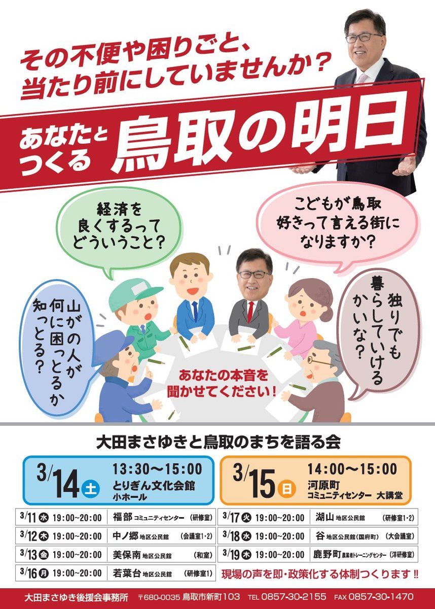 大田まさゆき後援会事務所〒680-0035 鳥取市新町103 0857-30-2155